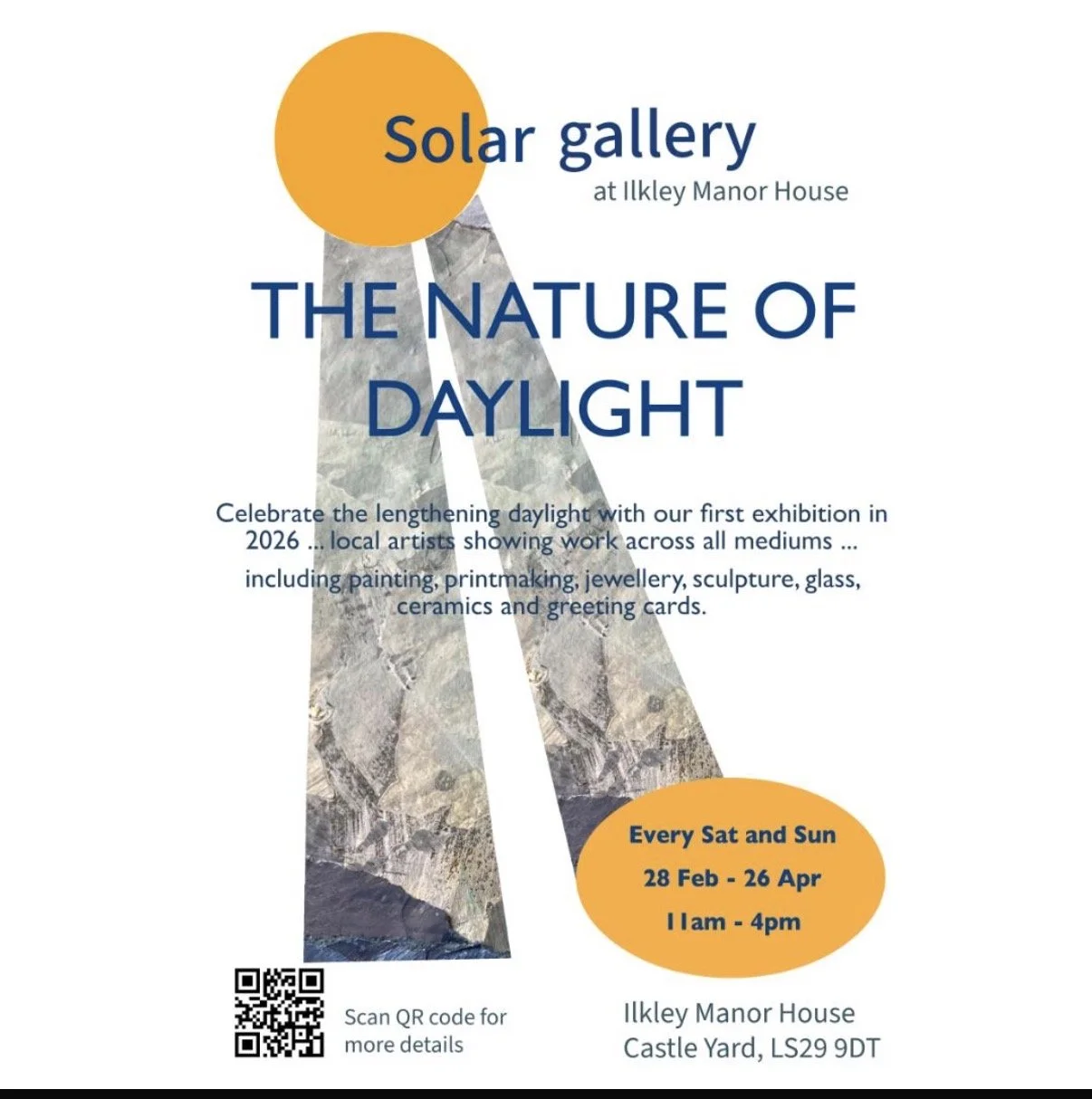 Sarah is delighted to have work included in the first of this year’s exhibitions at The Solar Gallery at The Ilkley Manor House. The exhibition is a celebration of Spring and the gradually lengthening days and is entitled: ‘The Nature of Daylight. The show features work from over 20 local, highly talented artists and includes paintings, ceramics, textiles, jewellery and print making. The gallery will be open each Saturday and Sunday from tomorrow, 28th February 2026, until April 26th. Opening hours are 11am -4pm. We look forward to seeing you!